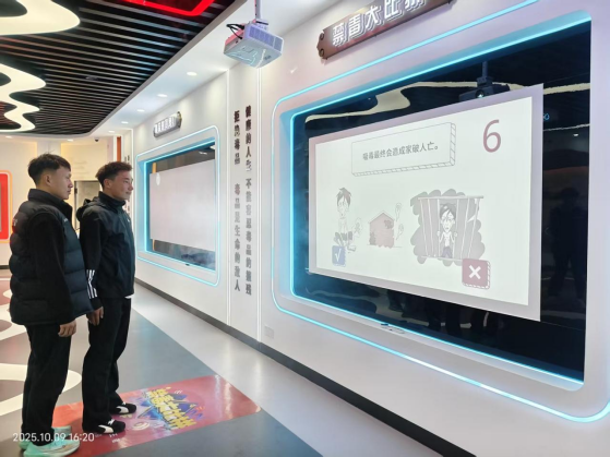 互动体验区成为此次学习的“生动课堂”。在禁毒知识问答区,同学们踊跃参与抢答,在紧张比拼中巩固识毒技巧,现场气氛热烈非凡;部分同学还体验了毒品危害模拟设备,直观感受吸毒对容貌与健康的摧残,强烈的视觉冲击让大家更坚定了远离毒品的信念。趣味十足的互动小游戏将专业禁毒知识转化为易懂易记的内容,让同学们在轻松氛围中筑牢防毒心理壁垒。