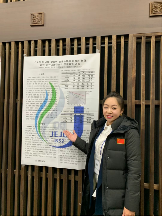 王瑞长期深耕在体育学领域的研究一线,发表了一系列研究成果。在韩国留学期间,她被聘任为韩国教练能力开发研究院济州中心的副会长,曾多次受邀参加相关会议。在本次会议中,王瑞发表了题为《中国留学生运动参与水平与学校生活满意度的关系:运动投入的调节作用》的论文,并参与了“体育及教练现场对话”环节,与国际专家展开热烈研讨,就冰雪运动经济与训练方法等前沿问题展开交流,进一步拓展了国际合作与科研视野。王瑞在会议期间的专业表现,受到了学者们的一致好评,充分展现了我校教师良好的精神风貌、科研素养与国际影响力,为我校在国际学术交流与教学科研提质等方面注入了前沿动力。