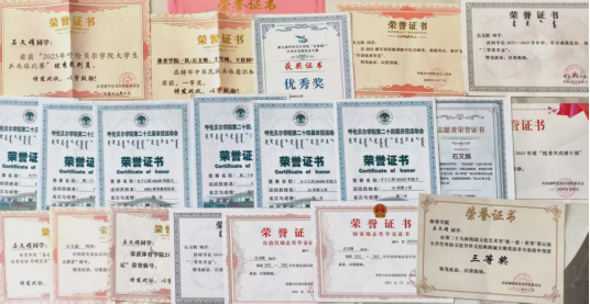 在校期间连续四年曾获得国家励志奖学金、自治区励志奖学金以及多次二等奖学金;荣获“优秀三好学生”“优秀共青团干部”“优秀标兵”“优秀团员”“优秀裁判员”等称号。曾参与“大学生英语非专业组朗诵”比赛荣获三等奖,第九届呼伦贝尔学院“互联网+”大学生创新创业比赛优秀奖等。